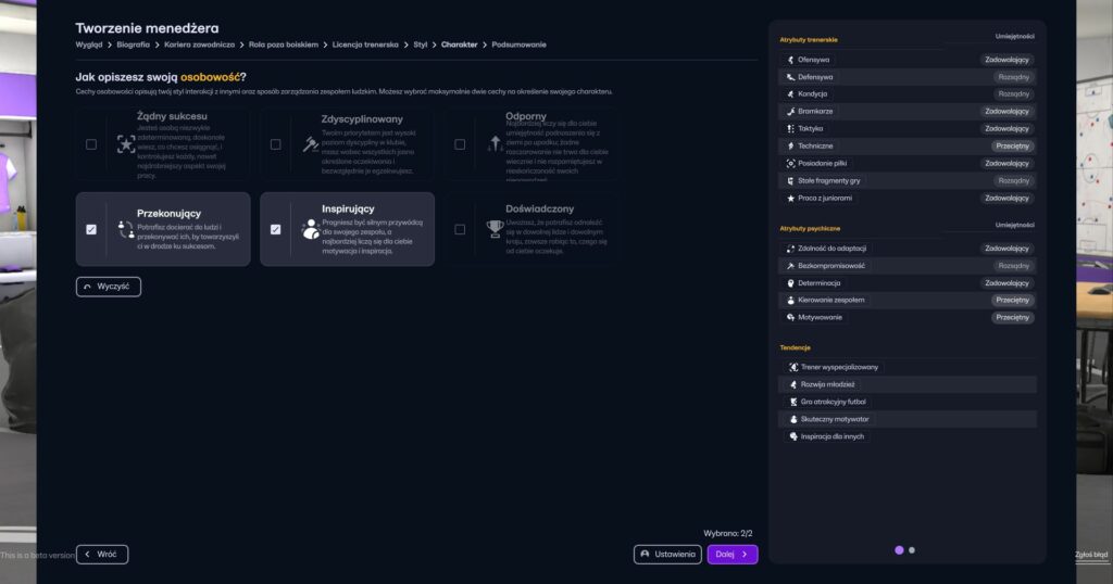 O błędach lokalizacyjnych nawet już nie wspominam. Zdania zaczynające się z małych liter. Dziwne tłumaczenia słów, które wyglądają jakby tłumaczył je automat – bo co do treści tłumaczenie jest nawet OK. – nie widzący szerszego obrazu tego co jest tłumaczone, dzięki czemu kiedy na przykład tworzyłem managera to wybierając kolejne „perki” widziałem jak zmieniają się moje kompetencje w różnych obszarach prowadzenia drużyny, ale nie byłem w stanie na 100% stwierdzić, czy ta zmiana była na plus, czy na minus.