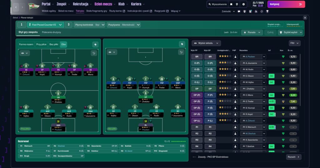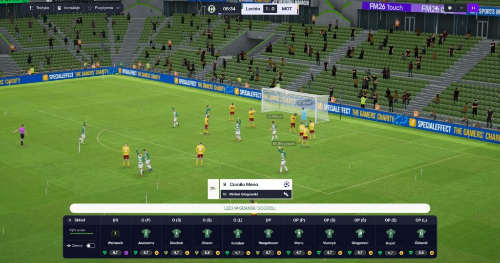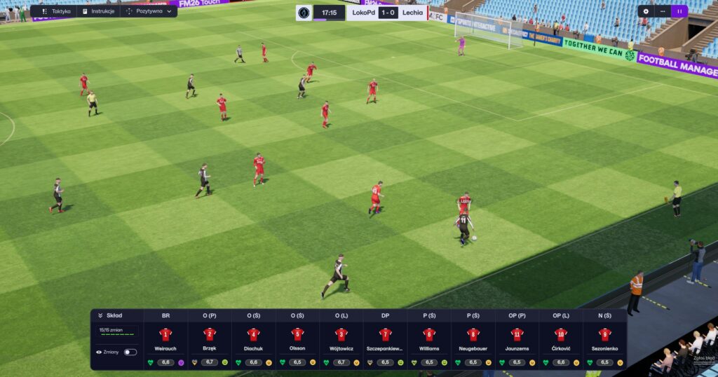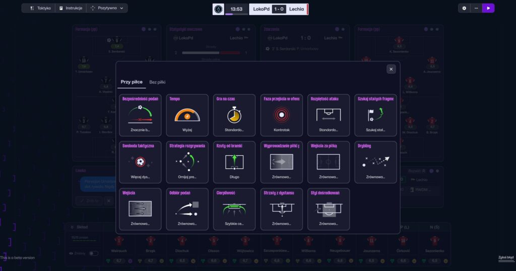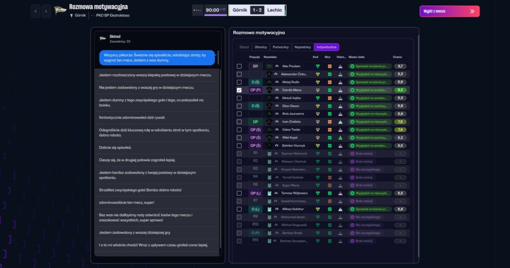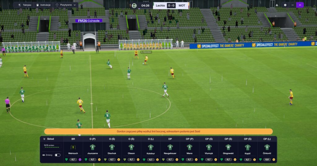 Ale zacznę od elementów, które wjechały mocno. FM26 jeszcze bardziej pogłębił możliwości taktycznego zarządzania drużyną. Kiedy ustawiamy swoją drużynę możemy osobno wybrać ustawienie i polecenia na segmenty, kiedy nasza drużyna jest w posiadaniu piłki i na te segmenty, kiedy piłkę posiada przeciwnik. Daje nam to niesamowitą elastyczność w prowadzeniu meczu. Zawodnik może zmienić miejsce na boisku w zależności od sytuacji. Może dostać zupełnie inną rolę. Cały zespół będzie miał inaczej położony nacisk na różne rzeczy. Oczywiście, jeśli chcemy w pełni wykorzystać tę możliwość, czeka nas tak naprawdę podwójna „praca”, bo kiedyś ustawialiśmy jedną taktykę, a teraz ustawiamy dwie, niejednokrotnie różne. Ale satysfakcja kiedy widzimy, że to działa, jest olbrzymia.