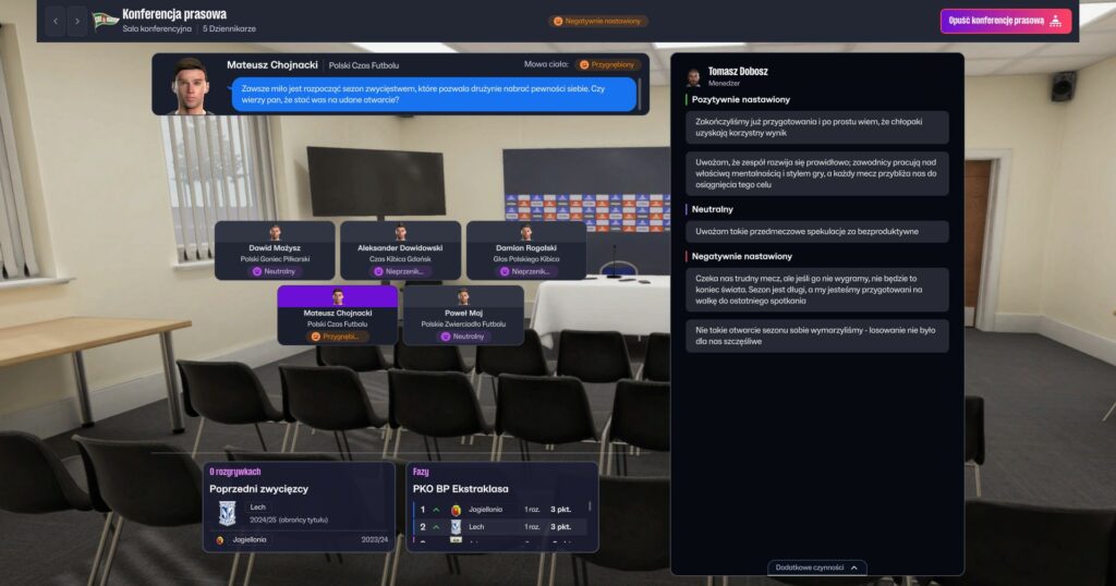 Kolejna rzecz to wszelkiego rodzaju konferencje. Zawsze lubiłem gadać z zawodnikami, czy prasą. Teraz zaczyna mnie to irytować. Niby jest więcej opcji odpowiedzi, ale każda jest bardziej sztuczna niż poprzednia. Mam wrażenie, jakbym był jakimś robotem a nie człowiekiem. Tak samo zawodnicy i dziennikarze. Pytania są nijakie, mechaniczne, suche. Nie ma w nich nic ludzkiego. Pogadanki meczowe też poleciały w dół. Niby więcej opcji, a ja mam wrażenie, że nie mam z czego wybierać.