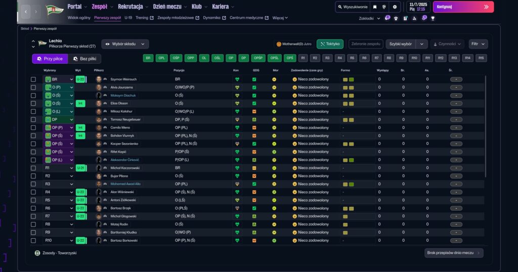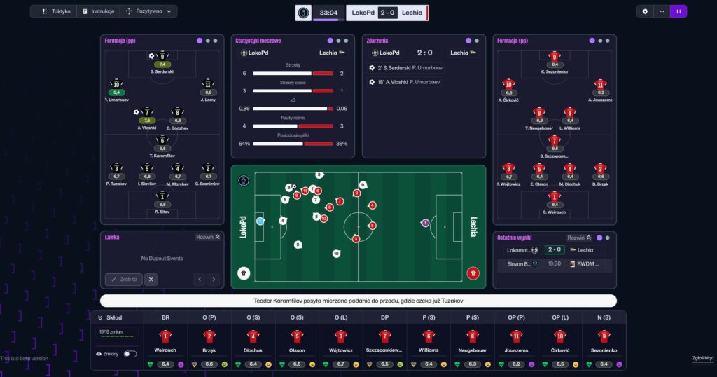 Najciekawszym przykładem elementu, z którym walczę ciągle są zmiany w składzie w trakcie meczu. Interfejs jest tam tak nie intuicyjny, że aż się chce płakać. Szukanie zawodników, bo przecież tam był ktoś jeszcze. Próby sortowania, które nie działają, albo działają w najgorszy możliwy sposób (po co sortować zawodników po pozycji kiedy to ona jest ważna, jak można po nazwisku).