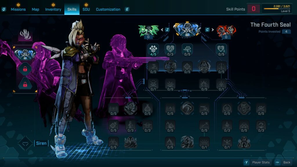 Do dyspozycji dostajemy cztery postacie, które różnią się podejściem do rozgrywki. Moim wyborem była Syrena Vex. Każda postać ma do dyspozycji trzy drzewka umiejętności powiązane z tak zwanymi Action Skill’ami. Są to umiejętności specjalne, które w zasadzie definiują to jak będziesz działał w walce. Vex ma możliwość chodzenia z tygrysopodobnym towarzyszem, który wspiera ją w walce. Może też przyzywać chwilowych pomocników (mobilnych z kosą i stacjonarnych strzelców) albo szaleć z dziwną formą energii. Każde drzewko to masa możliwości budowania naszej postaci, umiejki pasywne i aktywne. Zabawy dla miłośników tworzenia własnych buildów będzie masa.
