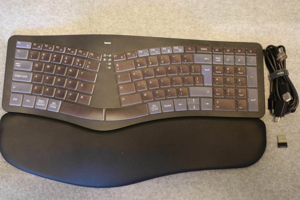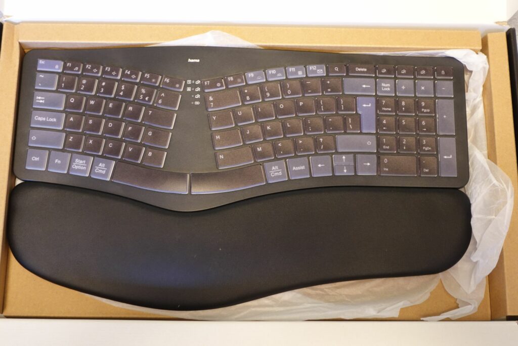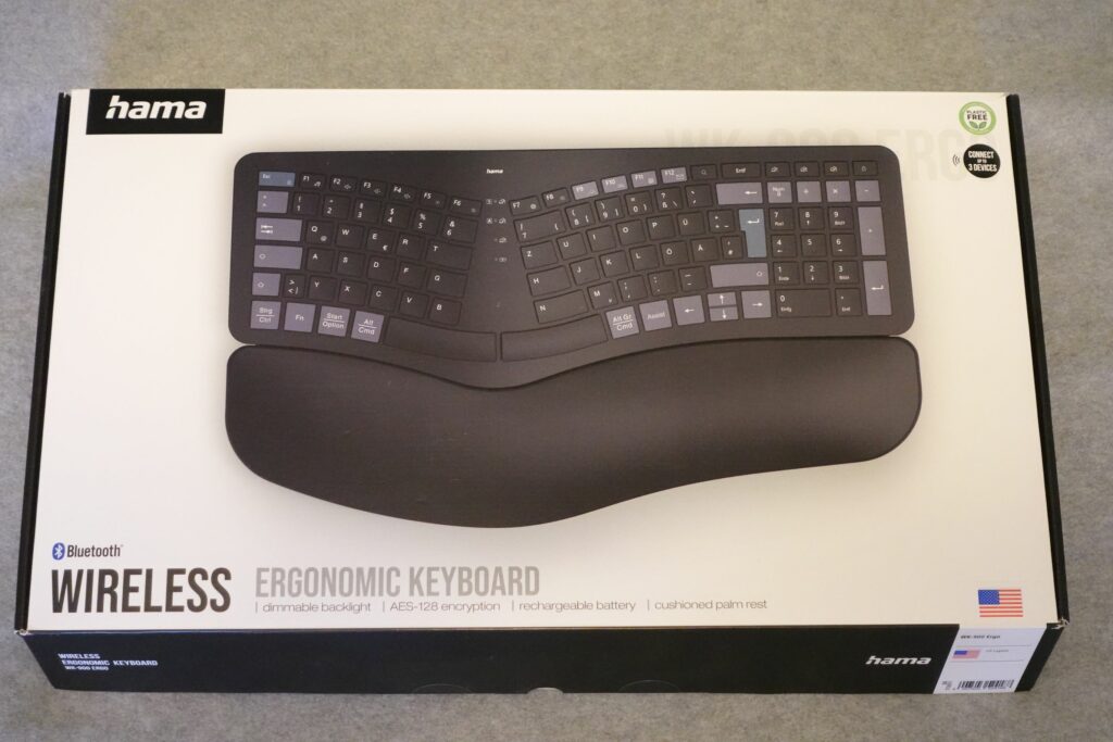 HAMA WK-900 Ergo, to pełnowymiarowa ergonomiczna klawiatura. Mamy więc do czynienia z dość dużym urządzeniem, które ma zadbać o naszą wygodę i sprawić, że ból nadgarstków odejdzie w niepamięć. W niepamięć ma też odejść problem z kablami, bo jest to urządzenie bezprzewodowe.