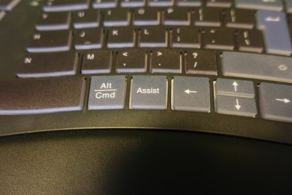Sama klawiatura robi wrażenie. Po pierwsze dawno nie widziałem „złamanej” klawiatury, czyli tego układu dwóch bloków klawiszy rozsuniętych na boki. Nawet spacja jest podzielona na pół. Ten układ ma wspomagać naturalne ułożenie dłoni podczas pisania, co sprawia, że osoby których praca wiąże się z pisaniem na komputerze (kodu, książek, blogów, czegokolwiek) będą odczuwały mniejsze zmęczenie nadgarstków, a i ból nie powinien się tak często pojawiać. Nacisk na wygodę zauważyłem też, kiedy zorientowałem się, że mięciutka poduszeczka pod nadgarstki jest zintegrowana z klawiaturą. Ciekawe rozwiązanie, ale muszę przyznać, że poduszeczka, którą tu zastosowano jest naprawdę wygodna i nie przeszkadza.